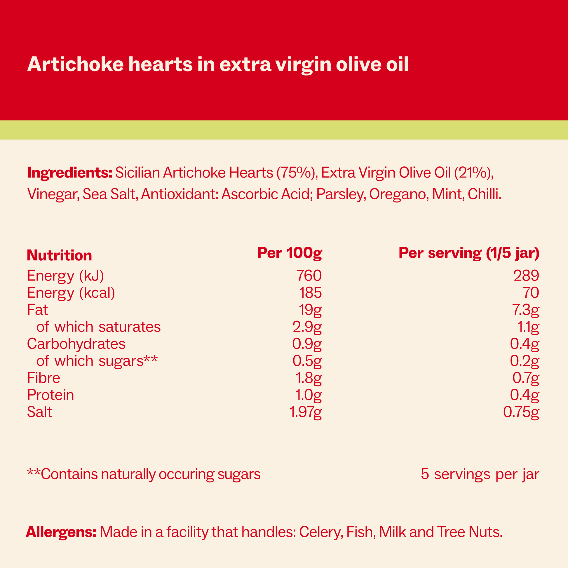 Seed oils? Not here. Just tender artichokes preserved in extra virgin olive oil, packed with flavour and totally low carb, with no added sugar. Serve before dinner as an antipasti, stir through your favourite pasta sauce for an extra umami hit, or whip up a quick artichoke and spinach dip to wow your friends any time of year. Simple, authentic, and just the way Nonna would’ve done it.