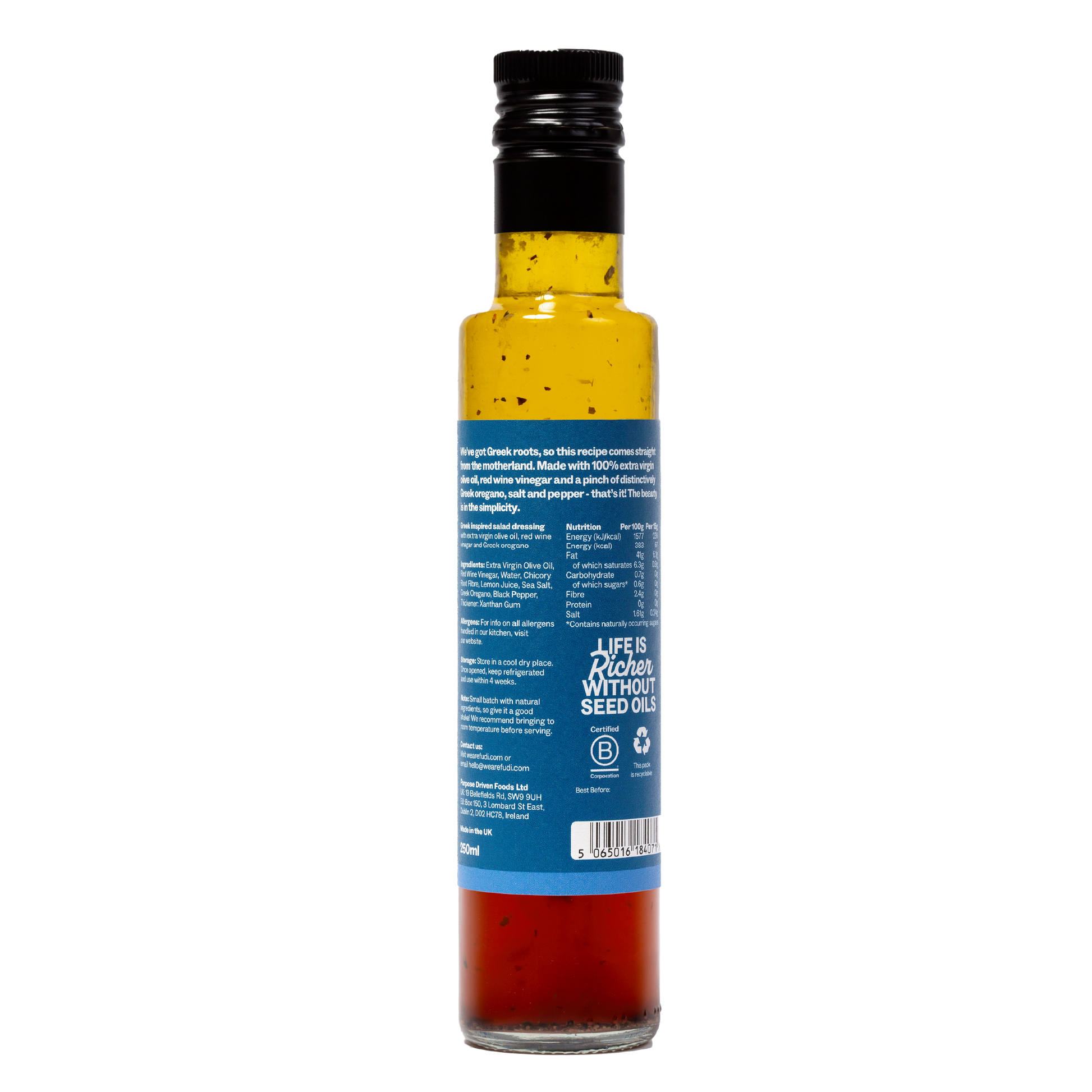 We've got Greek roots, so this recipe comes straight from the motherland. Made with 100% extra virgin olive oil, red wine vinegar and a pinch of distinctively Greek oregano, salt and pepper - that’s it! The beauty is in the simplicity.