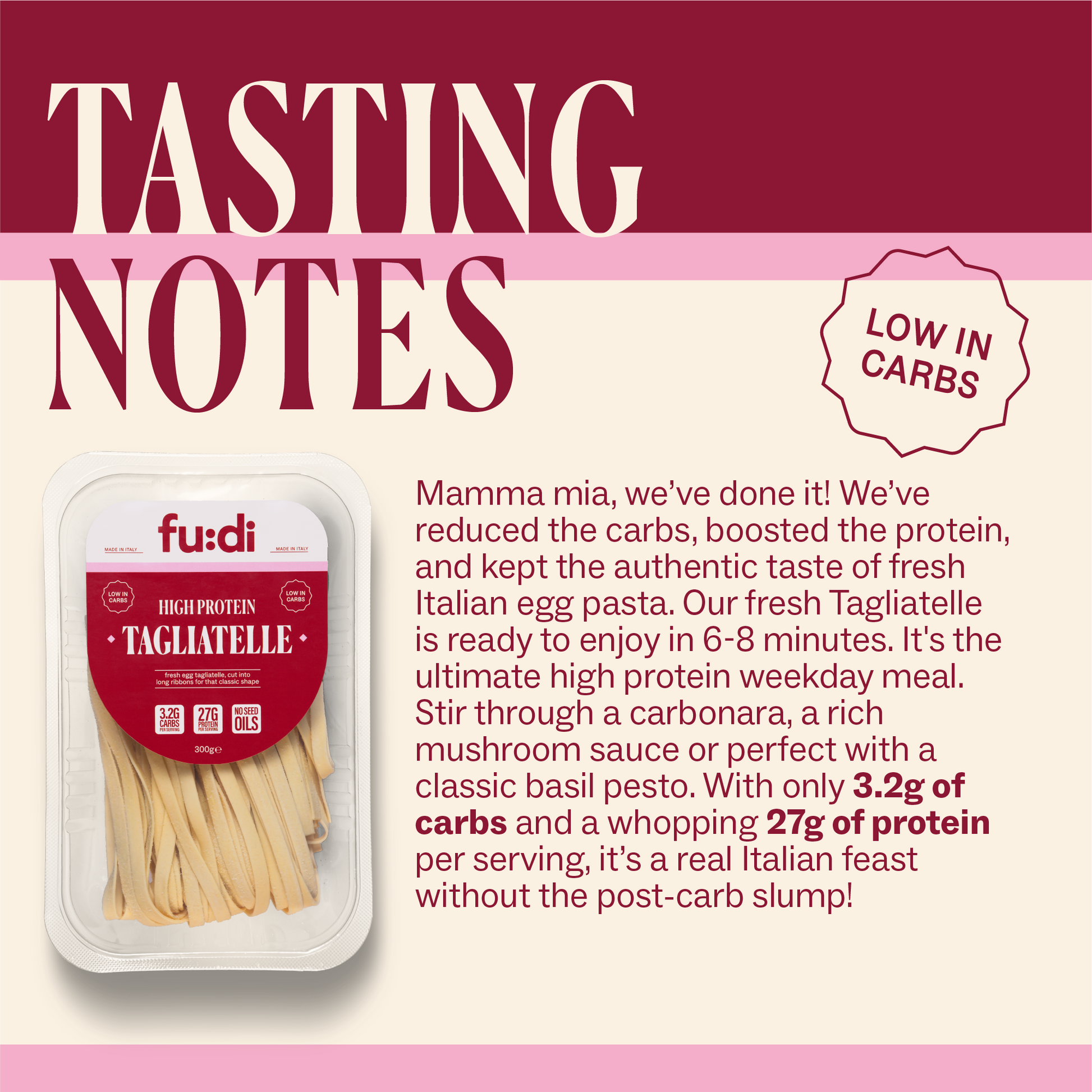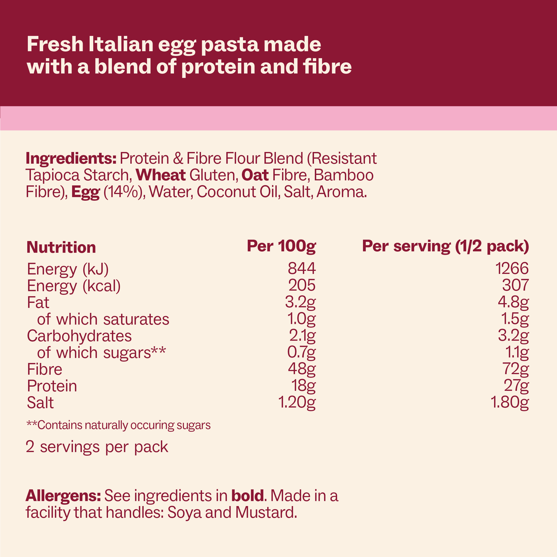 Our fresh Tagliatelle is ready to enjoy in 6-8 minutes. It's the ultimate high protein weekday meal. Stir through a carbonara, a rich mushroom sauce or perfect with a classic basil pesto. With only 3.2g of carbs and a whopping 27g of protein per serving, it’s a real Italian feast without the post-carb slump!