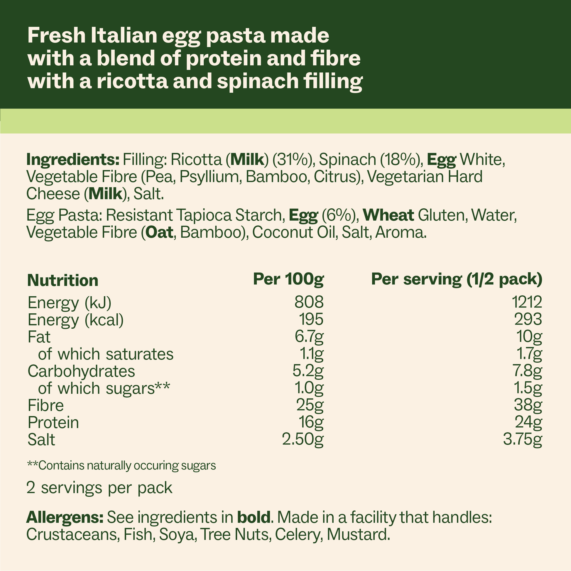 Made in Italy, our fresh ravioli is filled with creamy ricotta and spinach, and ready to enjoy in just 6-8 minutes. It’s the ultimate weekday treat! Stir through sizzling salted butter and sage or a spicy arrabbiata sauce for the perfect comfort food. With only 7.8g of carbs and a whopping 24g of protein per serving, it’s a real Italian feast without the post-carb slump!