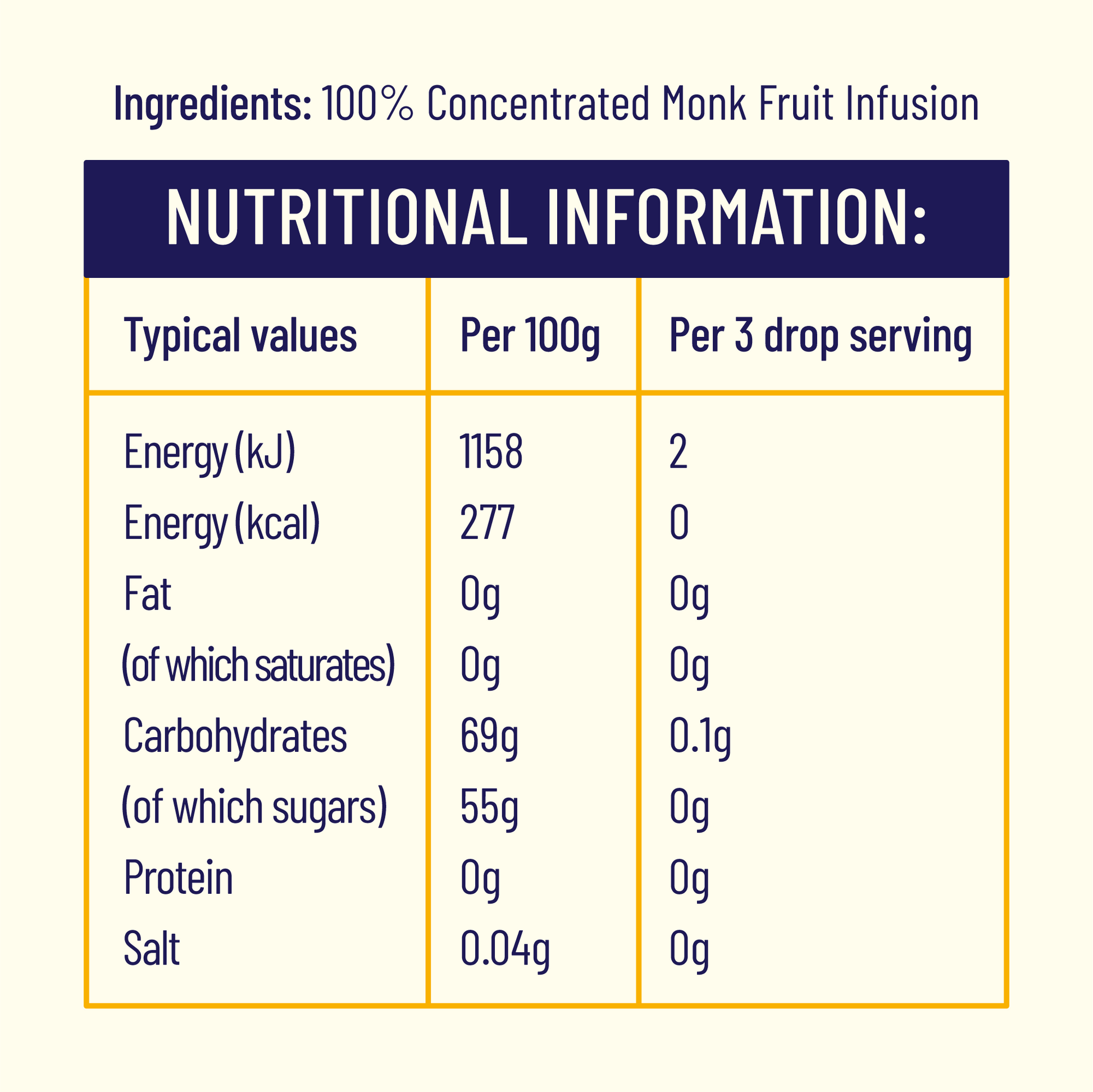 Discover the UK’s first 100% pure monk fruit drops, with no sugar, no fillers, no additives, and no aftertaste. Naturally keto and diabetic-friendly, just a few drops deliver the taste of sugar or honey without the guilt. Perfect for coffee, tea, cocktails, dressings, baking, and more, each 50ml bottle contains 377 servings.
