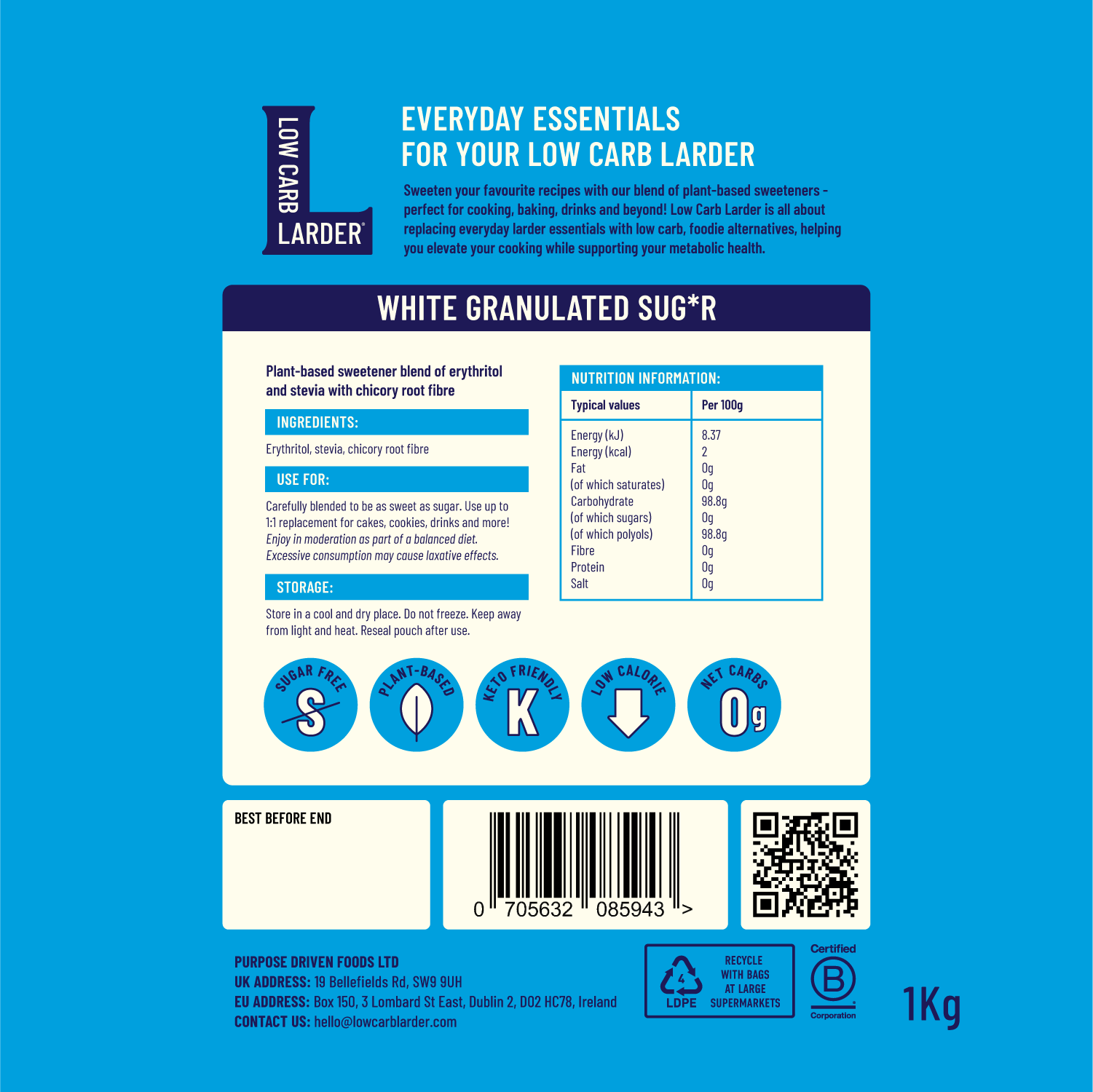 Low Carb Larder 'White Granulated Sug*r' is a plant-based sweetener blend of erythritol and stevia with chicory root fibre.
