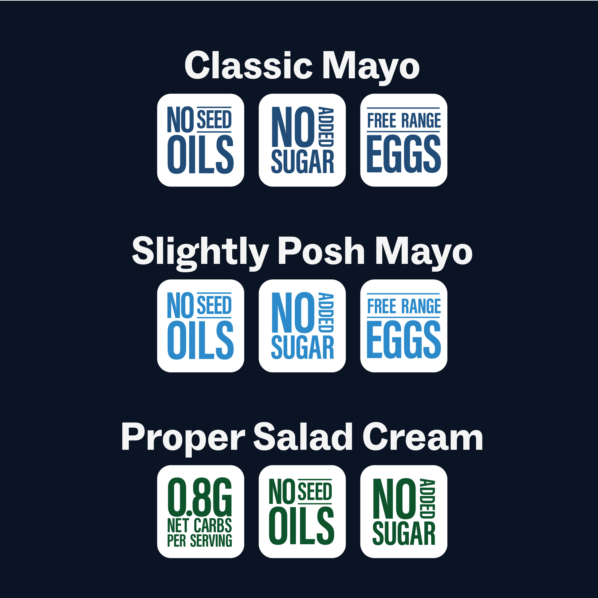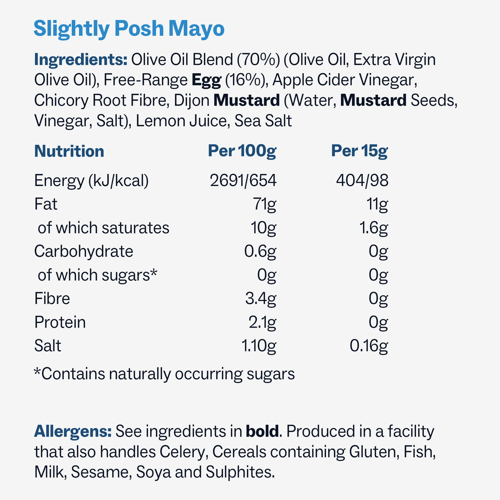 🫒 Slightly Posh Mayo – made with 100% olive oil and free-range eggs. A little fancier, full of flavour.